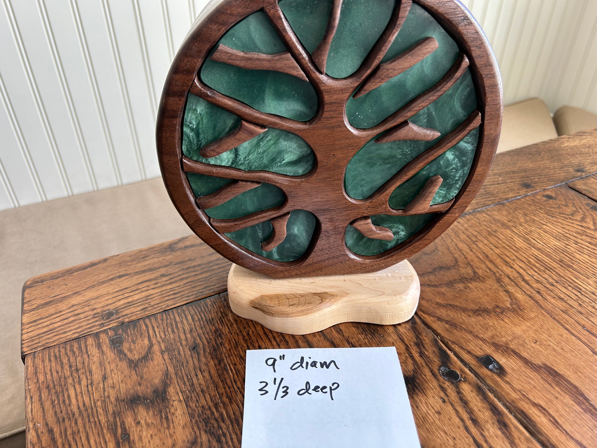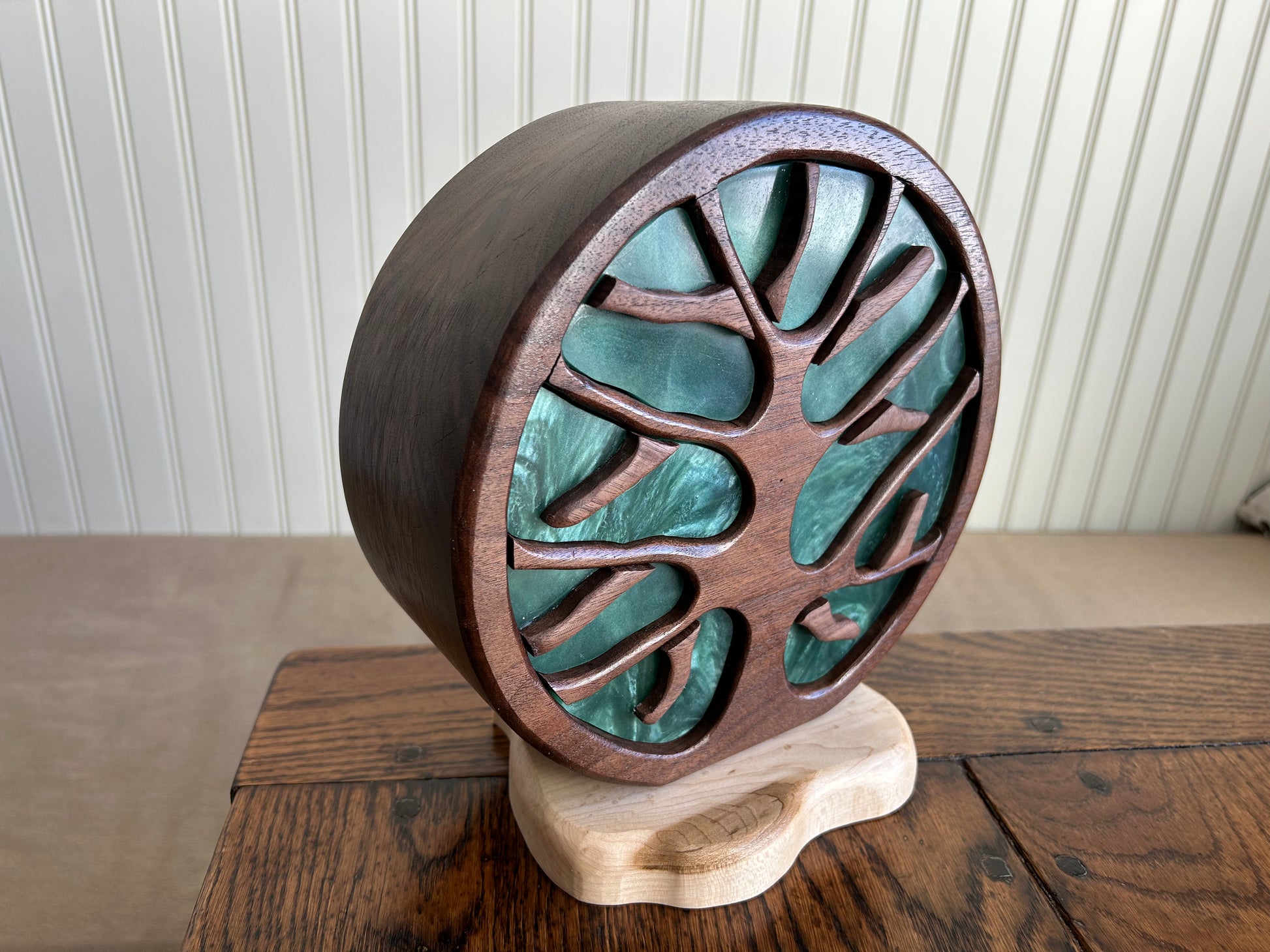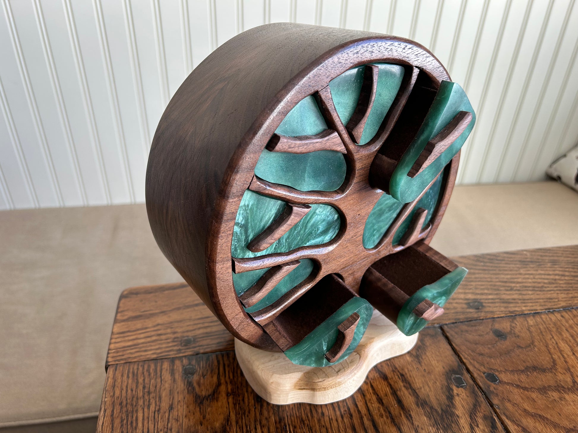 Standing 9" tall and 3.75 inches deep, this gem features beautiful walnut grain patterns on a maple base and has nine drawers for jewelry and other prized keepsakes. Contoured resin drawer faces with swirling patterns. Each drawer has a custom "twig" pull. Finished with several layers of shellac and Renaissance microcrystalline wax.