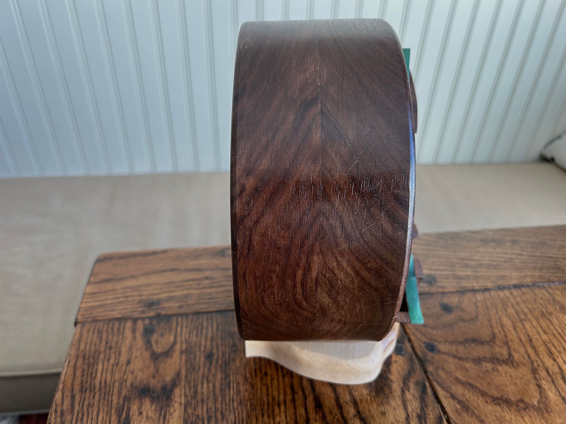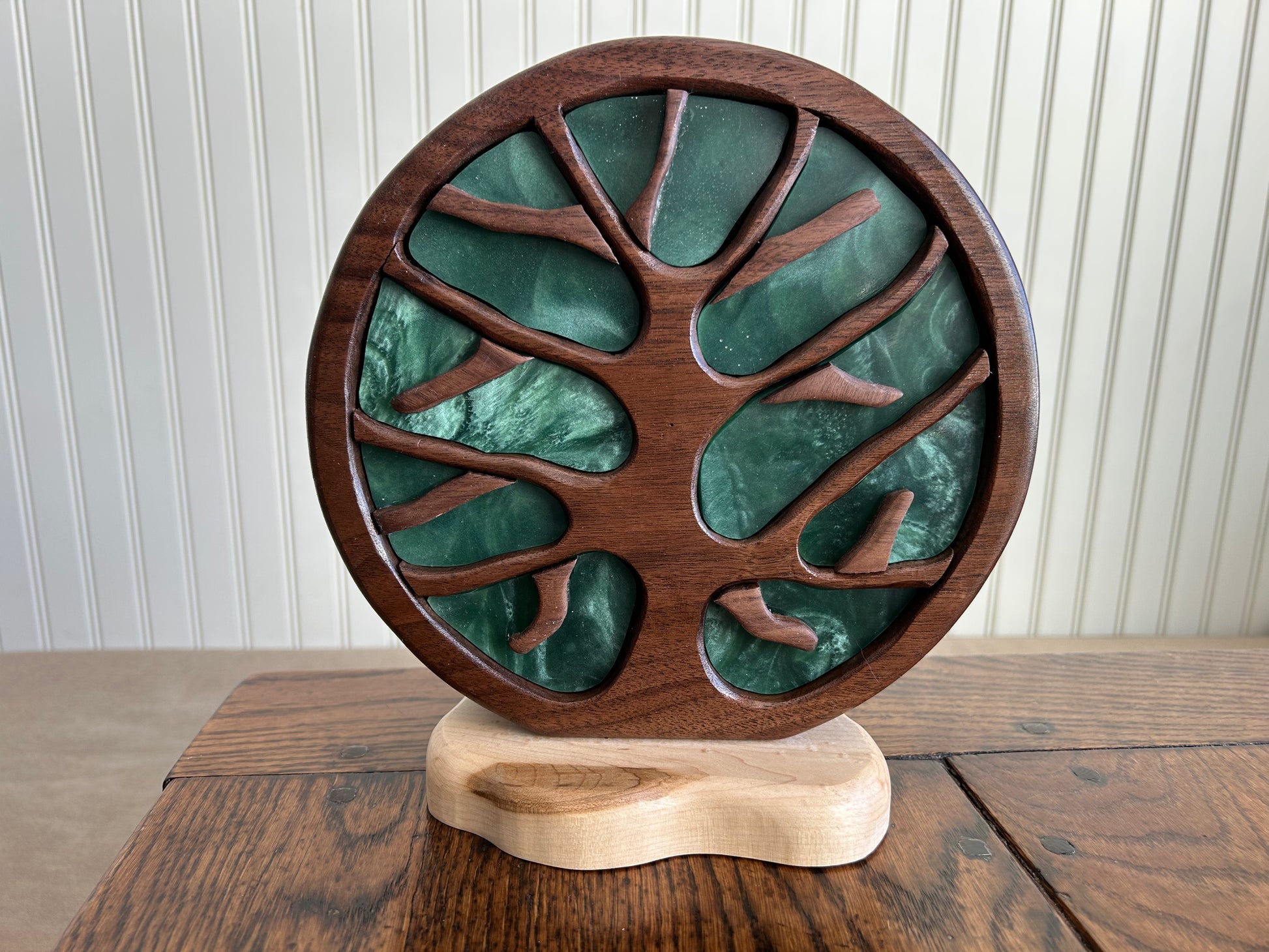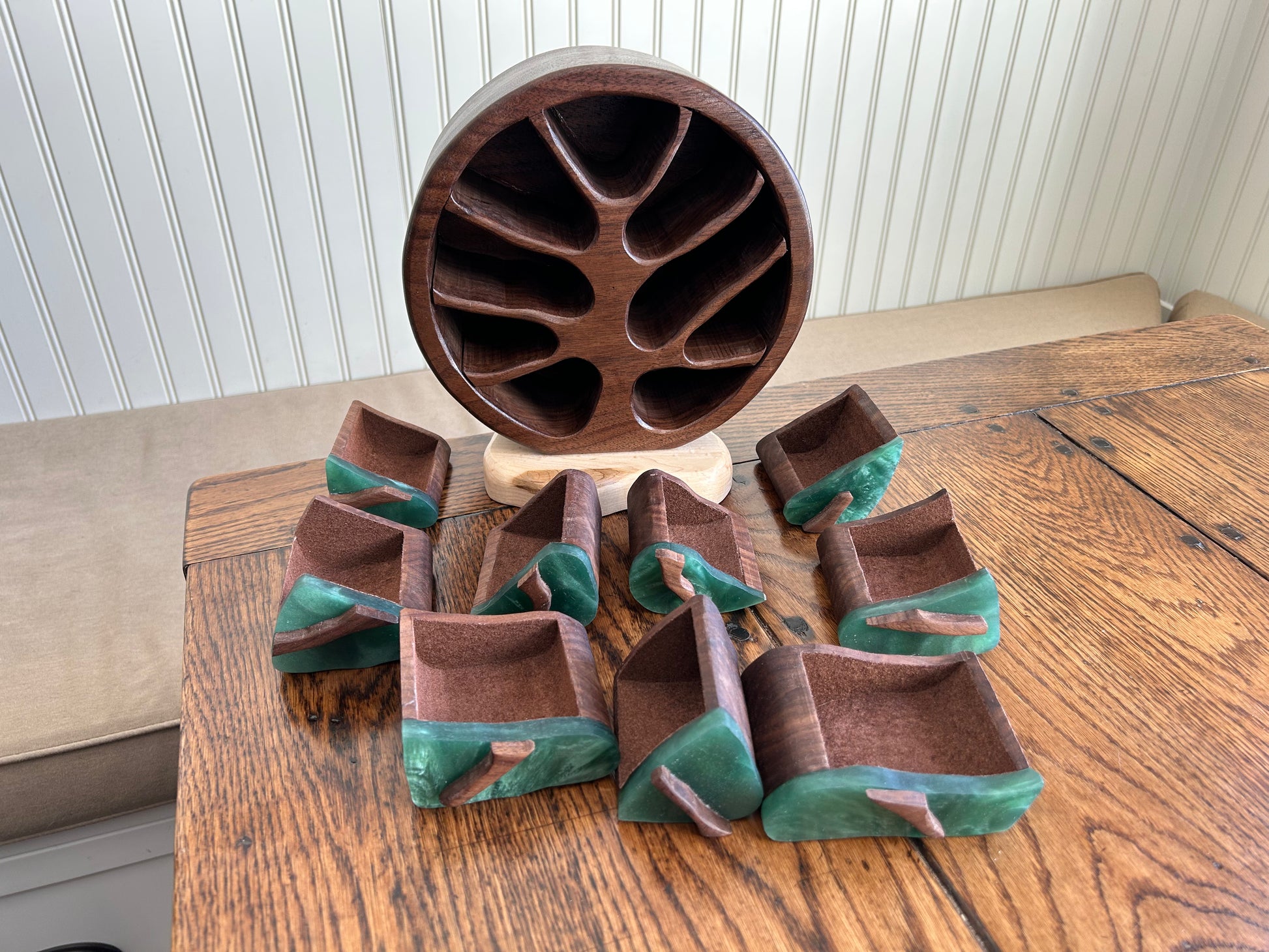 Standing 9" tall and 3.75 inches deep, this gem features beautiful walnut grain patterns on a maple base and has nine drawers for jewelry and other prized keepsakes. Contoured resin drawer faces with swirling patterns. Each drawer has a custom "twig" pull. Finished with several layers of shellac and Renaissance microcrystalline wax.