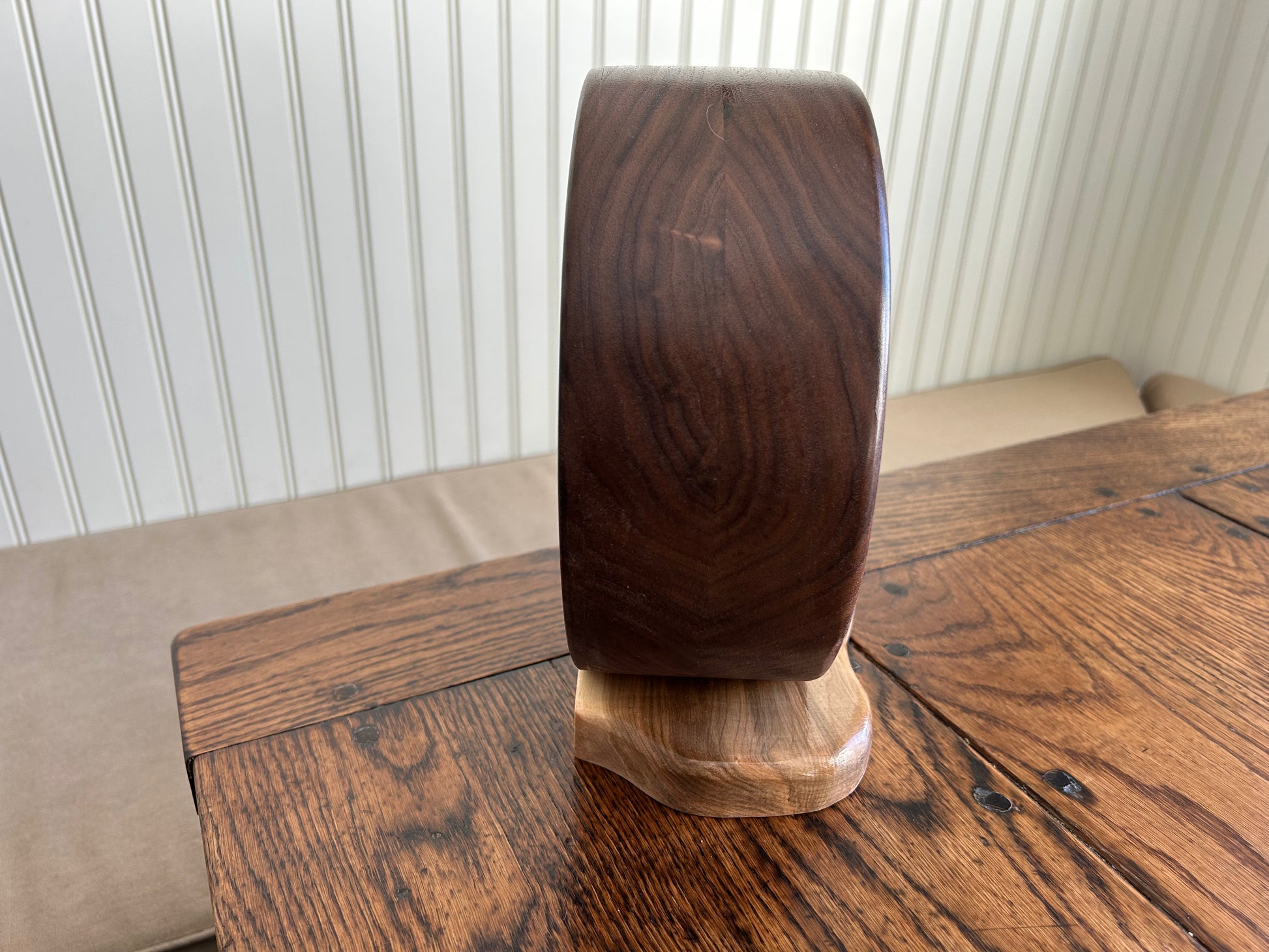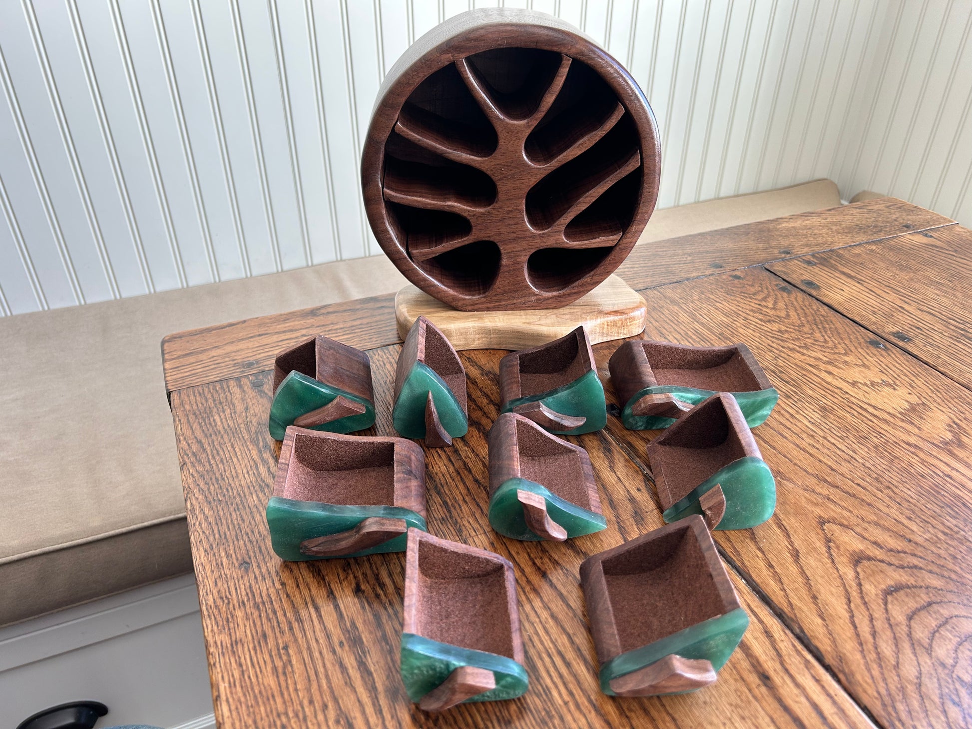 Standing 9" tall and 3.75 inches deep, this gem features beautiful walnut grain patterns on a spalted maple base and has nine drawers for jewelry and other prized keepsakes. Contoured resin drawer faces with swirling patterns. Each drawer has a custom "twig" pull. Finished with several layers of shellac and Renaissance microcrystalline wax.