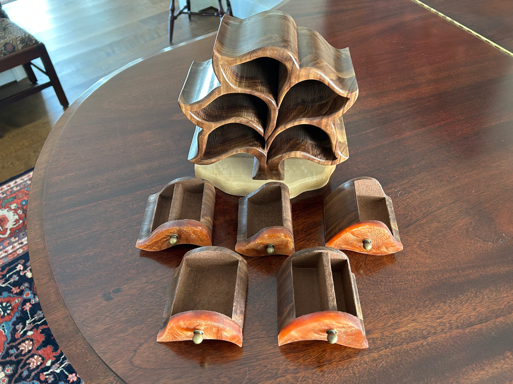 Black walnut keepsake box on a bird's eye maple base. Exquisite grain patterns typical of walnut with two multi-compartmental and three simple drawers. Drawer faces pop with contoured, swirled orange resin plates. 1/2 inch diameter brass drawer pulls secured with screws. All external surfaces treated with multiple coats of shellac and Renaissance wax for permanent finish. Soft layer of dark brown flocking lining each drawer interior adds beauty to this piece of functional art and provides protection for your treasures.